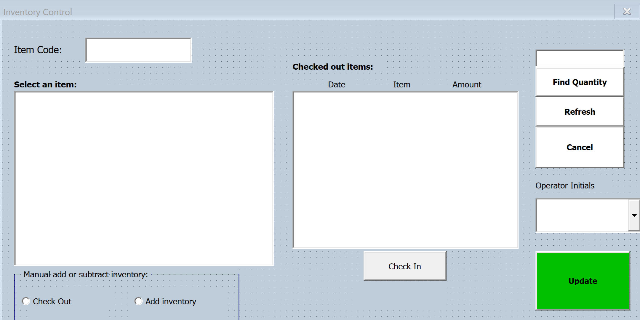 This is a full inventory control system with VBA forms that will place structure and efficiency into your business. You can add your products into the database and control your inventory via check in and check out system. You can scan product codes, find quantities, and receive material in. It also records all the transactions made for any further analysis needed. This is ideal for any business trying to create structure and a standard process into their inventory control system.Security:System provides a level of security where it will only let admin edit sheets manually. Any regular user is forced to use the form so you can be sure no one will force data in.