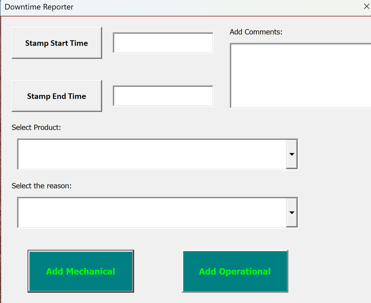 This program is a tool to provide more concise and accurate system for capturing downtime. You will be able to record line stops very easily and fast. With this program you are able to record the start of a line stop, select a reason, the product being ran and the end of the line downtime to have a record of total time lost.System Features: