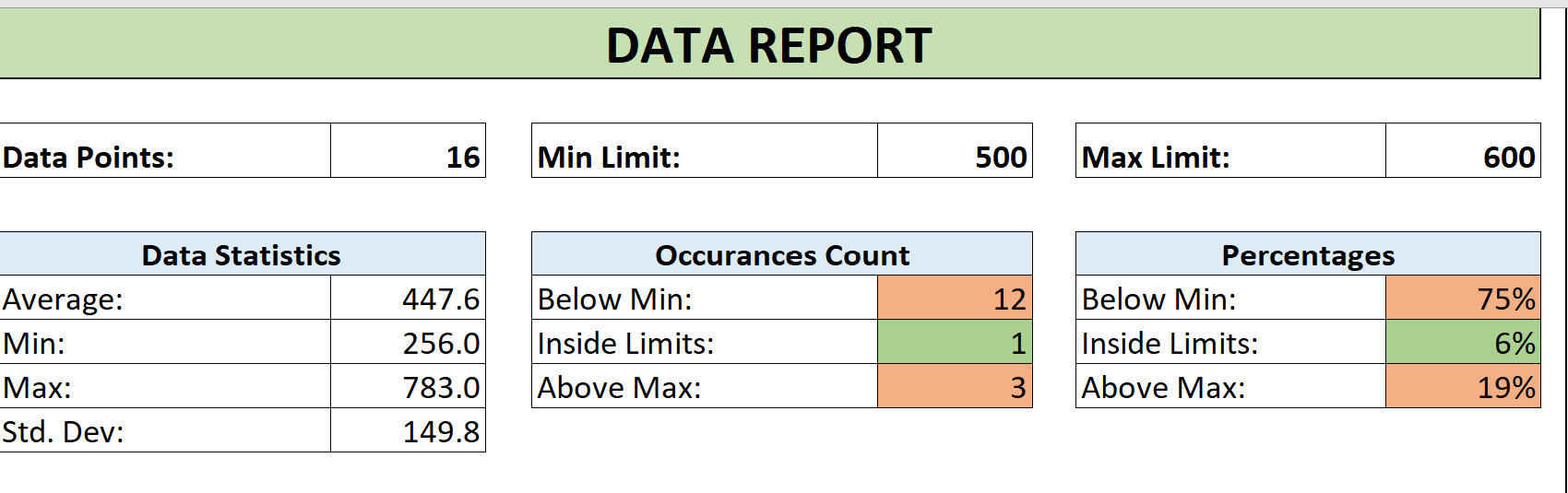This template will read a given column of number data pasted into sheet and return powerful insights into your data very quickly then create a report for you. Starts by pasting number data, clicking a button to specify lower /min and upper/max limit or threshold. Then you will get a report with statistics about your data.
